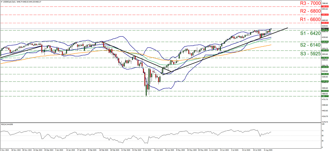 US stock markets were on the rise yesterday and its characteristic on a technical level that S&P 500, breached the 6420 (S1) resistance line, now turned to support reaching new record high levels. The upward movement of the index over the past week, allowed us to shift the upward trendline guiding the index’s price action since the 24th of April, to the right allowing for a renewal of the validity of the upward trendline. Given that the index’s price action was able to breach the prior record high level and that the RSI indicator is nearing the reading of 70, implying an intensifying bullish market sentiment for the index, we switch our bias for a sideways motion and adopt a bullish outlook for the index. Yet at the same time we note that the price action has reached the upper Bollinger band which in turn may slow down the bulls. We set as the next possible target for the bulls the 6600 (R1) resistance line. Should the bears take over, we may see the pair breaking the 6420 (S1) support line and aim if not reach the 6140 (S2) support level.