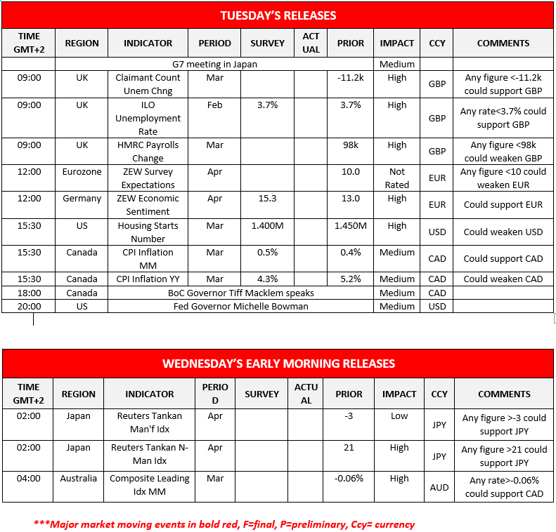 During today’s European session we note the release of UK’s employment data, the Eurozone’s ZEW Expectations and Germany’s ZEW Economic Sentiment both for April. During the American session we note the US Housing Starts Figure and Canada’s CPI print followed by BoC Governor Macklem’s and Fed Governor Bowman’s speeches. During the Asian session tomorrow, we note Japan’s Tankan Indexes for April followed by Australia’s Composite Leading Index for March.