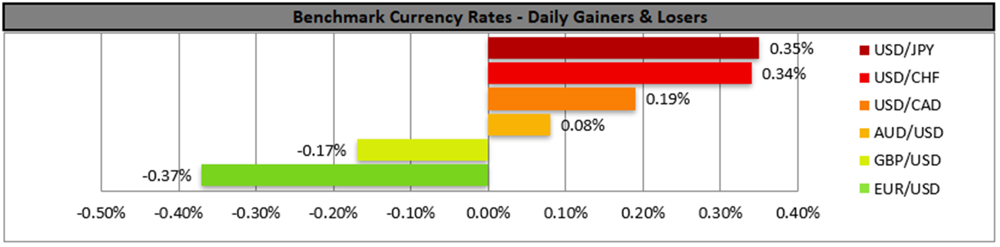 GBP/USD remained relatively unchanged yesterday, staying comfortably between the 1.2465 (R1) resistance line and the 1.2270 (S1) support line. We tend to maintain our bias for the sideways motion to continue, especially after cable’s price action was able to break the upward trendline guiding it since mid-March. Please note though that a slight bearish tendency may emerge as the RSI indicator remains below the reading of 50. Should the bears actually take charge of the pair’s direction we may see it breaking the 1.2270 (S1) support line and aim for the 1.2115 (S2) support level. Should the bulls take the reins of the pair’s direction, we may see cable breaking the 1.2465 (R1) resistance line and aim for the 1.2660 (R2) level.USD/CAD bounced on the 1.3335 (S1) support line yesterday, yet the overall picture of a sideways motion seems to be maintained. Hence we keep our bias for a sideways motion of the pair as it also broke the downward trendline incepted since the 10 of April. Please note that the RSI indicator below our 4-hour chart runs just below the reading of 50 implying a rather indecisive market, which may allow the sideways motion to continue. On the other hand, should the market sentiment start tilting towards the bearish side and the RSI indicator approach the reading of 30, we may see AUD/USD breaking the 1.3335 (S1) support line and start aiming for the 1.3230 (S2) support line, a level which has not seen any price action since mid-November last year. Should a buying interest be expressed by the market we may see the pair breaking the 1.3465 (R1) resistance line and aim for the 1.3560 (R2) level.
