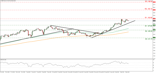 WTI’s price was on the rise over the past week, yet seems to have hit a ceiling at the 90.85 (R1) resistance line as it twice tested and failed to breach the level. We tend to maintain our bullish outlook as long as the upward trendline, initiated on the 24 of August, remains intact. Yet the fact that the commodity’s price seems unable to breach the R1 in conjunction with an easing of the bullish sentiment as the slight drop of the RSI indicator implies may allow for Brent’s price to stabilise somewhat. Yet for a switch of our bullish outlook in favour of a sideways motion bias, the commodity’s price has to break the prementioned upward trendline, signaling exactly the interruption of Brent’s upward movement. Should the bulls maintain control over Brent’s price action, we may see the commodity’s price breaking the 90.85 (R1) resistance line clearly and take aim at the 95.15 (R2) resistance base, which was able to cap the upward movement of the commodity’s price in late October and early November, last year. On the flip side, should the bears take over, we expect Brent’s price to drop, breaking the prementioned upward trendline yet for a bearish outlook we would require Brent’s price to also break the 97.80 (S1) support line that held its ground against downward pressure on the 5 of the month, and take actively aim of the 85.50 (S2) support level.