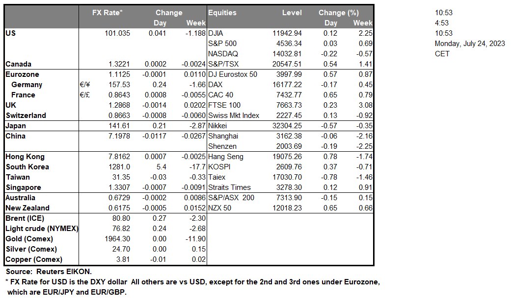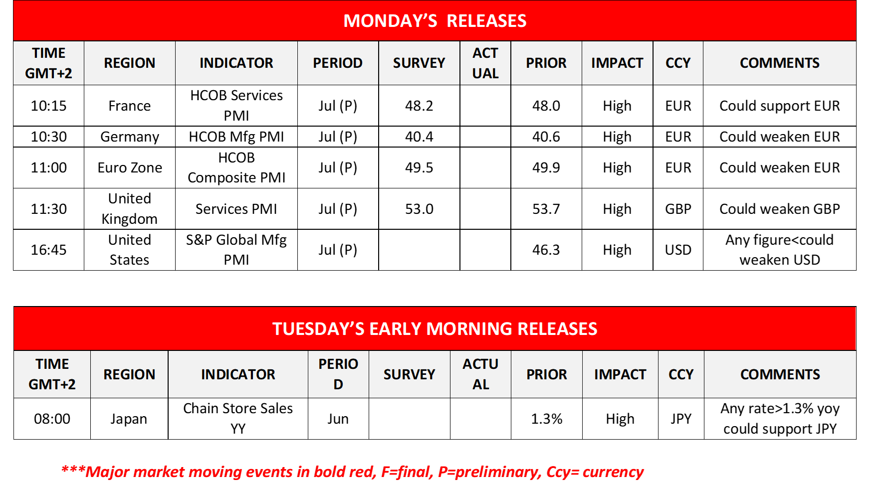Today in the FX market, we highlight the preliminary July PMI figures of France, Germany and the Eurozone as a whole and should the readings show another contraction of economic activity in the manufacturing sector, especially Germany’s, our worries for the economic outlook of the Eurozone are to be intensified and could weaken the common currency. As for the UK we highlight the release of the preliminary services PMI figure, as the sector comprises a substantial part of the UK’s GDP figure.