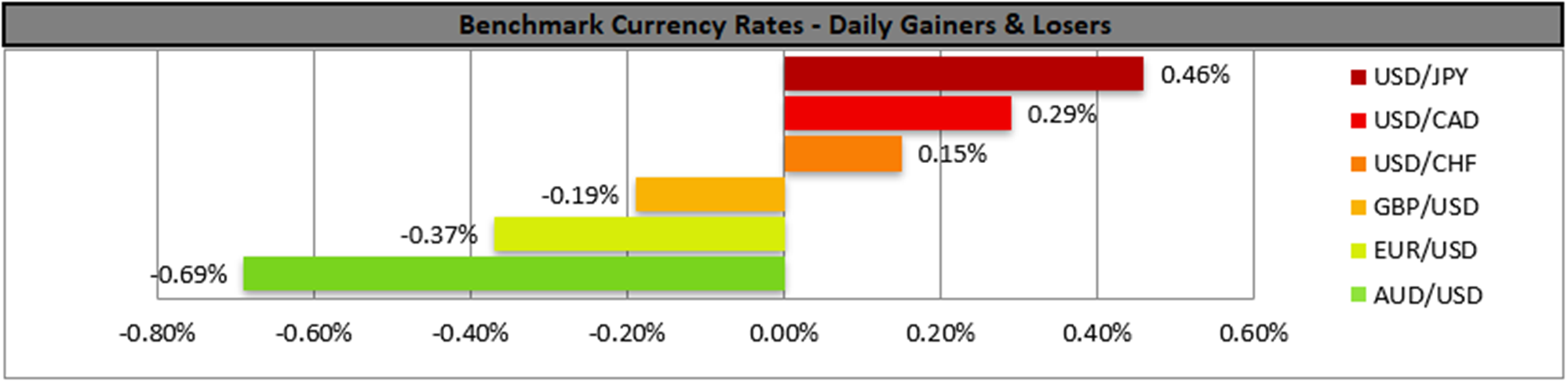 In the FX market, USD/JPY edged higher yesterday and dropped during today’s Asian session, yet its price action remained well between the 146.25 (S1) support line and the 149.15 (R1) resistance level. We continue to maintain a bias for the pair’s sideways motion to be maintained and we note that the RSI indicator continues to run along the reading of 50, which implies a relative indecisiveness on behalf of market participants for the pair’s direction. Should the bears gain control over the pair’s direction, we may see it clearly breaking the 146.25 (S1) line and start aiming if not reaching the 142.20 (S2) level. Should the bulls take over, we may see the pair breaking the 149.15 (R1) line and start aiming for the 151.20 (R2) level.