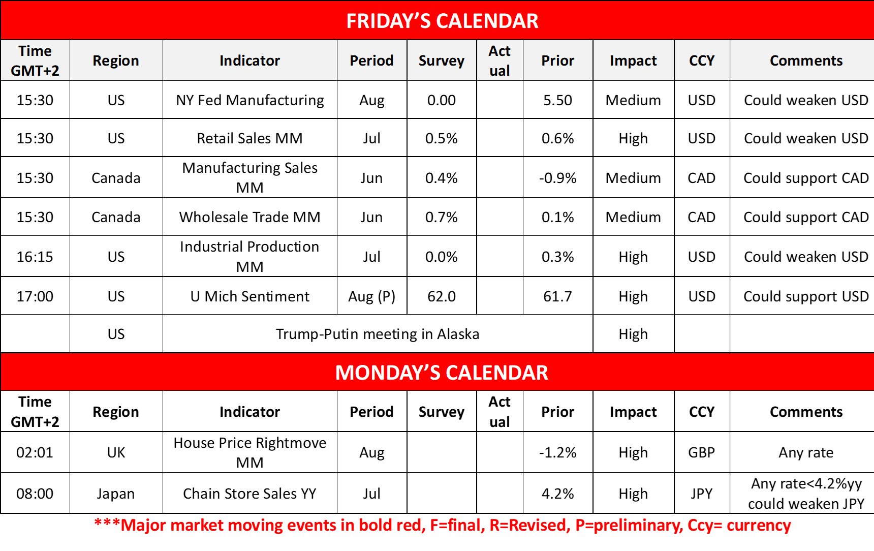 On a fundamental level, we highlight today’s meeting between Trump and Putin in Alaska. Over the past week, media had highlighted the possibility of a deal under which Ukrainian territory could be given to Russia in exchange for peace. Yet White House officials have downplayed the possibility of such a scenario and its characteristic that they regard the meeting more like a “feel out” for the two Presidents. Also the notion of a second meeting emerged, after a short while, hence today’s meeting is expected to be of a preparatory nature to see if the two sides actually agree on what is to happen and should an agreement be reached, then Ukraine and possibly the Europeans will be invited. Should the meeting result in a thawing of tensions in the US-Russian relationships, we may see the USD getting some support, while should the summit result in a failure we may see it weighing on the greenback.