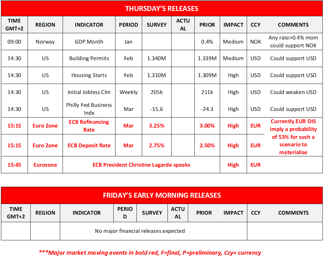 The USD was on the rise against its counterparts yesterday maybe with one exception being the JPY which tended to enjoy more safe-haven inflows than the greenback given the developing banking crisis. It should be noted that the USD gained despite the retail sales growth rate for February contracting more than expected, indicating a relative unwillingness or inability on behalf of the average US consumer to actually spend more in the US economy. The fact that the USD strengthened despite the contracting retail sales growth rate was indicative of how the markets were justifiably more focused on the developing banking sector crisis and especially Credit Suisse. It should be noted that Credit Suisse’s share price dropped more than 25% yesterday, yet other European banks such as Deutsche Bank and UBS were also under substantial pressure yesterday, yet there seem to be some signs of stabilisation today. Given the assistance provided by the Swiss National Bank to Credit Suisse on more than $54 billion the company may be allowed to survive and markets may be allowed to calm down somewhat while European banks slip away from the worst outcome, yet there is still wide uncertainty on how the situation will develop. As the banking crisis unfolds in Europe, ECB has to deliver an interest rate decision later today and the expectations of the market seem to be divided.