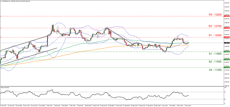 Looking at #US100 4-hour chart we observe the index extending its sideways motion between the 12400 (R1) resistance and 11850 (S1) support levels over the past two weeks, after it broke above the descending trendline incepted since the 15th of February. We maintain our sideways bias and supporting our case is the RSI indicator below our 4-hour chart which register a reading of 48, showcasing indecision surrounding the index. Adding to our case towards consolidation near the current level is the merging of the price action with both the 100 and 200 period moving average lines. We note nonetheless that the results of the NFP report on Friday alongside today’s speech by Fed Chair Powell, could distort is sideways motion and create Volatilitas. Should the bulls take initiative, we may see the break above the 12400 (R1) resistance level and the move near the 12750 (R2) resistance barrier. Should the bears dominate over the index direction we may see the break below the 11850 (S1) support level and the move near the 11550 (S2) support base.