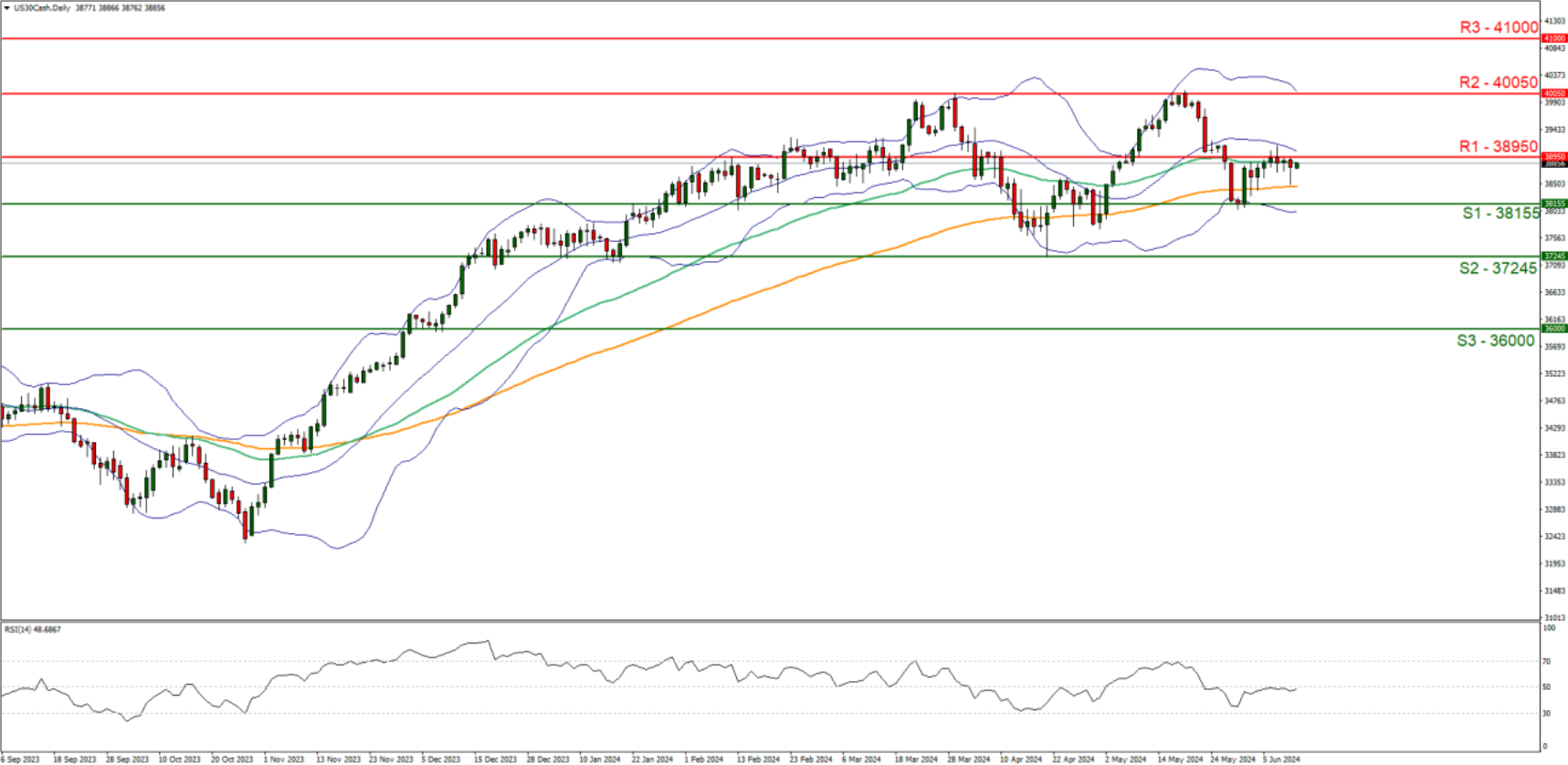 US30 edged slightly higher since our last report. We opt for a sideways bias for the index and supporting our case is the RSI indicator below our chart which currently registers a figure near 50, implying a neutral market sentiment, in addition to the 50 and 100 moving averages appearing to be flattening out. For our sideways bias to continue, we would require the index to remain confined between the sideways moving channel defined by the 38155 (S1) support line and the 38950 (R1) resistance line. On the flip side for a bullish outlook, we would require a clear break above the 38950 (R1) resistance line with the next possible target for the bulls being the 400050 (R2) resistance level. Lastly, for a bearish outlook we would require a clear break below the 38155 (S1) support line with the next possible target for the bears being the 37245 (S2) support level