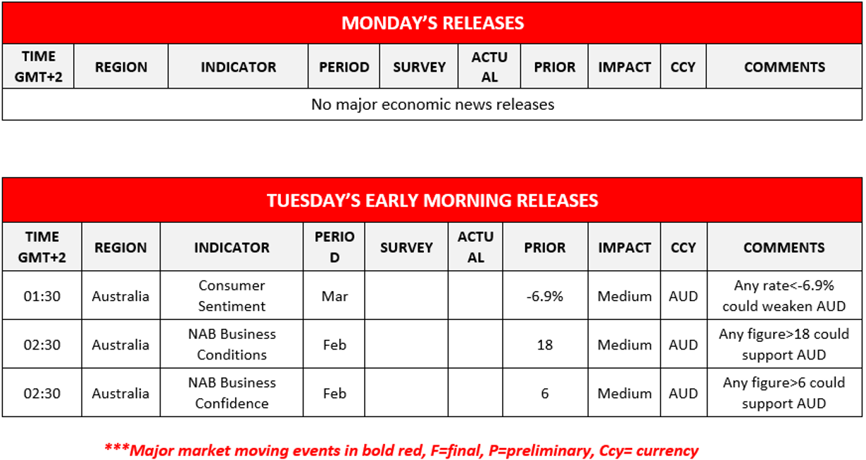 Industrial Output and Retail Sales for February, the French Final HICP rate for February, alongside Eurozone’s Industrial Production for January and New Zealand’s GDP rate for Q4. On Thursday the main event is ECB’s interest rate decision and ECB’s President Lagarde speech after the March meeting. We also highlight Japan’s Exports and Imports rates alongside Australia’s Employment and Unemployment Rate, all for the month of February. We also note release of the US weekly initial jobless claims figure and the Philly Fed Business Index for March. On Friday we highlight Eurozone’s Final HICP print, Canada’s Producer Prices and the US Industrial Production rate all the month of February alongside the preliminary University of Michigan’s Sentiment and Expectations indices for March.