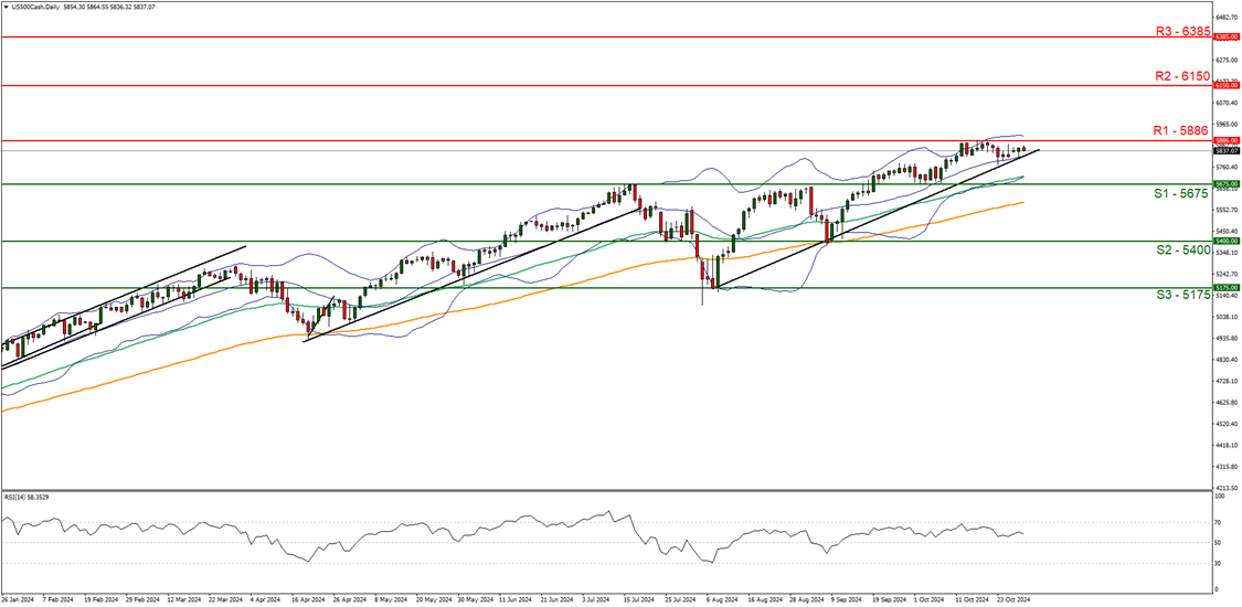 In the coming days, we expect the release of some high-impact financial data from the US that could create increased volatility in the US Equities markets. Starting with the release of the US PCE rates for September on Thursday. The rates are expected to slow down, showing an easing of inflationary pressures in the US economy and if so could add more pressure on the Fed to proceed with its rate-cutting path maybe even with a faster pace. Thus such a release could further ease the tight financial conditions surrounding the US economy and thus in turn may aid US Equities. Yet, the most crucial financial release is expected to occur on Friday with the release of the US October employment report. The Non-Farm Payrolls figure is expected to drop to 115k if compared to September’s 254k, the unemployment rate to remain unchanged at 4.1% and the average earnings report also to remain unchanged at 4.0% yoy. Overall, in the event that the predictions made by economists are materialized, it could provide support for the US Equities markets as it could add pressure on the Fed to proceed with a faster easing of its monetary policy.
