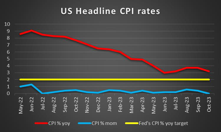 The USD seems about to break the three-week losing streak against its counterparts, yet the US employment report for November is still to be released and could alter the picture. The next week is to be very interesting for the greenback. We make a start with the release of the US CPI Rates for November on Tuesday. The forecasts are for inflationary pressures to have eased in the past month. Should that be the case we may see the market’s expectations for an earlier rate cut by the Fed in 2024, intensifying which could weaken the USD ahead of the Fed’s interest rate decision on Wednesday. The bank is widely expected to remain on hold at the range of 5.25-5.50% and its characteristic that Fed Fund Futures imply that the market has currently almost fully priced in such a scenario, with a 99% probability. It should also be noted that the market seems to also expect the bank to start cutting rates as early as March next year and proceed with another four rate cuts until 2024 is over. So the market’s attention is expected to be on the Fed’s accompanying statement and Fed Chairman Powell’s press conference later on. Should these two elements remain hawkish contradicting the market’s expectations for an early rate cut, we may see the USD relenting some ground and vice versa. The release may have ripple effects beyond the FX market, say for example on gold and US stock markets. Yet the suspense for USD traders is to be continued as on Thursday we note the release of the US retail sales consumer confidence for November and on Friday we get the preliminary S&P PMI figures for the same month.