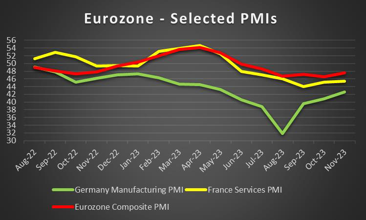 The common currency is about to end the week in the reds against the USD and JPY, yet remains relatively unchanged against the GBP. The monetary policy outlook of the ECB seems to be weighing on the common currency. For the time being the market is expecting the bank to remain on hold on Thursday keeping the refinancing rate at 4.5%. Currently, EUR OIS imply a probability of 94.56% for such a scenario to materialise, yet also that the bank is to start cutting rates in early March and end the year with a total of 6 rate cuts. It should be noted that the HICP rate has slowed down considerably in November’s preliminary release, nearing the bank’s 2% target, strengthening the case for earlier rate cuts. Should the bank on Thursday in its accompanying statement and/or ECB President Lagarde’s press conference later on, show signs that the bank intends to start cutting rates early next year, we may see the common currency losing some ground. Yet we also tend to remain worried about economic activity and growth, given the contraction marked by the revised GDP rate for Q3, despite being a shallow one. Hence we tend to focus also on the release of the preliminary PMI figures for December, with a special focus being on Germany’s manufacturing PMI figure. Should we see an improvement in economic activity, we may see EUR traders getting a boost, yet should the figures remain below the cut-off point of 50, implying another contraction of economic activity, yet narrower, we may see that boost being moderated.