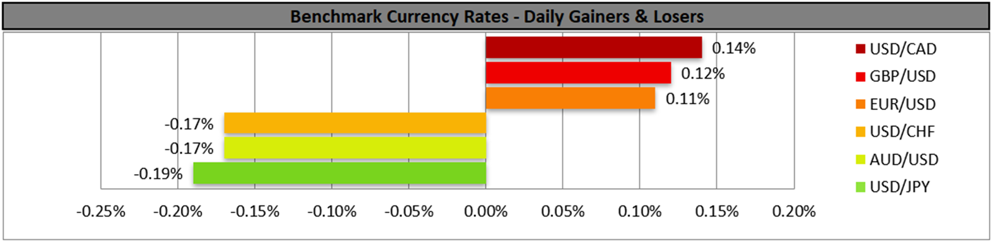 EUR/USD remained stable between the 1.1665 (S1) support line and the 1.1915 (R1) resistance level. The upward trendline guiding the pair since the 21st of November remains intact, allowing us to maintain our bullish outlook for the time being. The RSI indicator also implies a bullish predisposition of the market, yet the stabilisation of the pair over the past few days allows for the possible emergence of a sideways motion. For the bullish outlook to be maintained we would require the pair to clearly break the 1.1915 (R1) resistance line, with the next possible target for the bulls being set at the 1.2115 (R2) level. Should a bearish outlook emerge, we may see EUR/USD breaking the prementioned upward trendline and continue lower to clearly break the 1.1665 (S1) support line thus opening the gates for the 1.1465 (S2) support level.