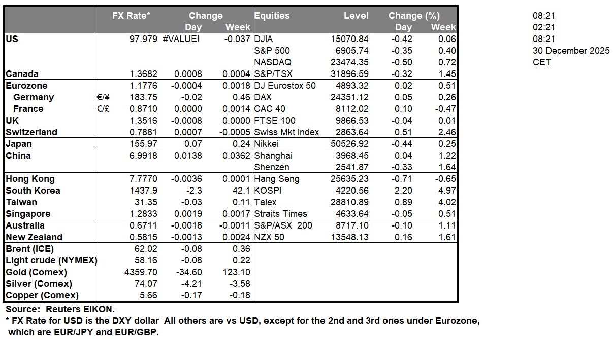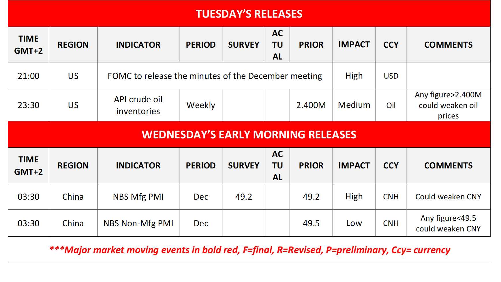 The USD remained relatively stable against its counterparts in the FX market yesterday, while the correction lower of gold and silver prices shook the markets. Today, we highlight in the late American session the release from the Fed of the December meeting minutes. Please note that in its last interest rate decision, the bank cut interest rates by 25 basis points as was widely expected, yet Fed policymakers seemed to be divided about the way forward. The new dot plot showed that Fed policymakers expect the bank to cut rates only once in the next year. On the contrary, the market still currently maintains expectations for the bank to cut rates twice in 2026, once in April and once in July, as per Fed Fund Futures, hence implying that the market tends to lean more on the dovish side. Should we see more Fed policymakers expressing doubts about a continuation of the easing of the bank’s monetary policy, we may see the USD getting some support as the market may have to readjust its expectations for the Fed. At the same time, a more hawkish-than-expected content of the document could weigh on gold’s price as well as US equity markets. On the flip side, should the market’s dovish expectations be reaffirmed, we may see the USD losing ground, while at the same time could provide support for gold’s price and US stock markets.