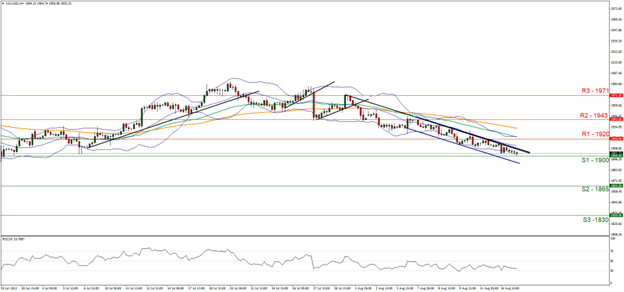 利 precious metal appears to be in a downwards fashion with the precious appear to be aiming for the $1900 (S1) key psychological support level, after having broken the 1920 (R1) support turned resistance level. We tend to maintain a bearish outlook for the commodity and supporting our case is the RSI indicator below our 4-Hour chart which is currently near the 30 figure , implying a bearish market sentiment, in addition to the downwards moving trendline incepted on the 31 of July and the downwards moving channel incepted on the 4 of August. For our bearish outlook to continue, we would like to see a clear break below the 1900 (S1) key psychological support level, with the next possible target for the bears being the 1865 (S2) support base.