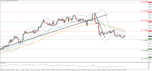 Later today, the market is expected to shift its attention towards the release of the latest inflation report from the US for the month of January and precious metal traders in particular will be glued to their seats. According to forecasts, the year-on-year CPI print is expected to ease to 6.2% from the 6.5% recorded in the previous month and should the actual rate meet the expectations we may see the dollar ease from its one-month highs, whereas gold may shine in the eyes of investors, as a result of the negative correlation between the greenback and the shiny metal. Yet forecasts are for the month-on-month rate to accelerate implying that inflationary pressures are still simmering under the surface, which may allow for the Fed’s hawkishness to endure, thus softening the blow on the USD, if not provide even a bit of support for the greenback and thus capping any gains for gold’s price if not pushing it lower. At this point would like to note the elevation of US yields since the beginning of the month as it takes some of the shine from Gold’s price given that investors may find bonds as more lucrative alternative to gold. Should US yields regain the upside momentum we may see gold’s price coming under pressure.
