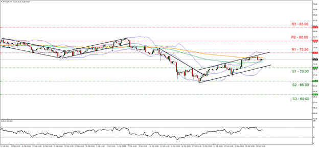 Looking at WTICash 4-hour chart we see crude extending its climb to higher ground the past week as indicated by the ascending channel, and it is currently gearing up to challenge the 75.50 (R1) resistance barrier. We hold a bullish outlook bias for the commodity given its short-term upward trajectory and supporting our case is the RSI indicator below our 4-hour chart which registers a value of 62, showcasing bullish sentiment surrounding WTI. Should the bulls extend their dominance, we may see the break above the 75.50 (R1) resistance level and head towards the 80.00 (R2) resistance barrier. Should on the other hand the bears take over, we may see the break below the lower bound of the ascending channel, the break of the 70.00 (S1) support level and the retracement to lower ground, closing in the 65.00 (S2) support base.