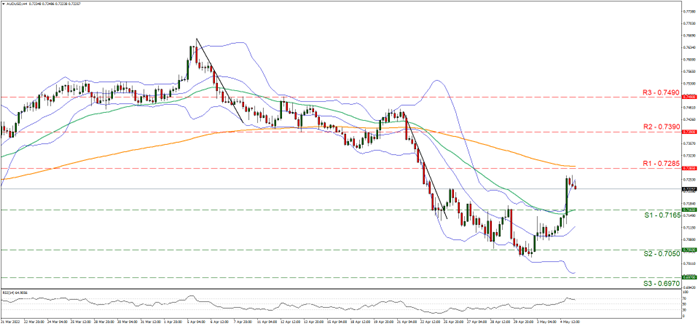 시장의 전망과 같이 연준은 지난 20년 만에 기준금리를 50bp 인상하였고 이후 시장에 큰 파장이 있었습니다. the bank sounded confident citing a healthy employment market with a robust number of job gains and declining unemployment while also cited that inflationary pressures are high reflecting supply and demand imbalances. The bank also noted the hardships stemming from the war in Ukraine which could add additional upward pressure on inflation as well as the COVID-related lockdowns in China which “are likely to exacerbate supply chain disruptions”. In his press conference Fed Chairman Powell, despite foreshadowing future rate hikes to come, also stated that the bank is not actively considering 75 basis points rate hike which tended to disappoint traders and invited the greenback bears in. USD positions lost ground across the board yesterday and characteristically AUD/USD jumped breaking the 0.7165 (S1) resistance line, now turned to support.