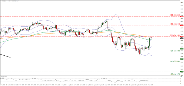 Dow Jones jumped at yesterday’s Fed’s interest rate decision reaching the 34150 (R1) resistance line. The index’s ascent higher pushed the RSI indicator below our 4-hour chart, near but just below the reading of 70, implying that a bullish sentiment exists in the markets. Also the price action has reached the upper boundary of the Bollinger bands, which may imply that some correction lower is possible, while the Bollinger bands widened to accommodate the price action’s sudden jump. On the other hand, cable was unable to break the 34150 (R1) resistance line, which is the upper boundary of its current sideways movement. Hence, to change our current bias in favor of a sideways movement, we would require the price action to clearly break the prementioned resistance line and the formation of higher peaks and higher troughs.