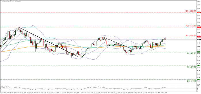 WTI rose yesterday and during today’s Asian session approaching the 108.50 (R1) resistance line. Overall we tend to maintain a bias for a sideways movement of the commodity’s price given that the main body of the price action remains confined between the 108.60 (R1) resistance line and the 97.50 (S1) support line. It should be noted that the RSI indicator below our 4-hour chart is between the readings of 50 and 70 implying a rather bullish sentiment in the market, possibly driven there also by the rise of the price yesterday, yet the price action has reached the upper Bollinger band and may imply that a correction lower is possible. It should be noted that the OPEC is to have a ministerial meeting today and on Friday and the market’s main interest lays on which decisions are to be met about production levels for oil of the member states and Russia.