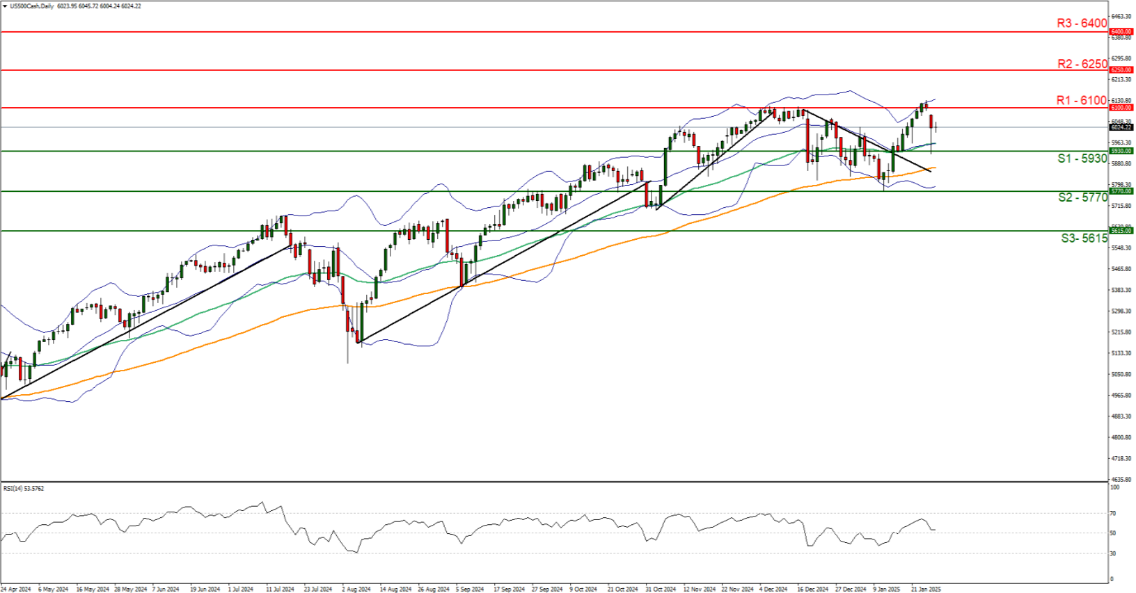 The S&P 500 and NASDAQ 100, have sharply declined during Monday’s trading session. We note that there are significant financial releases stemming from the US this week, in addition to the Fed’s interest rate decision which is set to occur tomorrow. In this report, we will focus on the recent developments surrounding DeepSeek in addition to discussing the Fed’s interest rate decision tomorrow and for a rounder view we provide a technical analysis of the S&P 500’s daily chart.