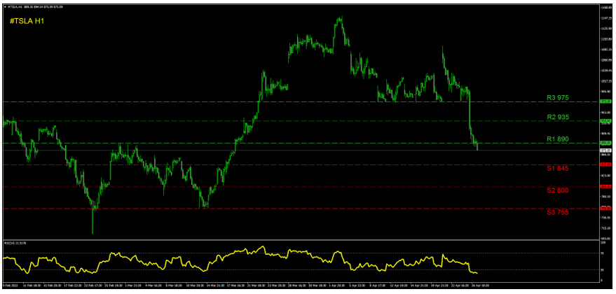 After the recent selloff Tesla’s share has dropped into the price range that was used before the 18 of March, which is below the currently noted (R1) 890 resistance level. If this trend is to continue, a move to the (S1) 845 support level may be imminent. A more intense selling move can force the price action to even lower grounds like the (S2) 800 support level or the (S3) 755 barrier. In the scenario of a rebound upwards, we may see a resurgence towards the (R1) 890 resistance level. The (R1) has been used as a resistance and a support in the past, indicating traders tend to respect it. If the upward trend persists, we may see the price action being pushed towards the (R2) 935 line. On the other hand, for the share price to fully recover and reach ground seen recently we may require a buying move able to top the (R3) 975 line. This would elevate the price action to the price range used previously in April. Currently, the RSI indicator has dropped below the 30-line giving the notion of an oversold position.
