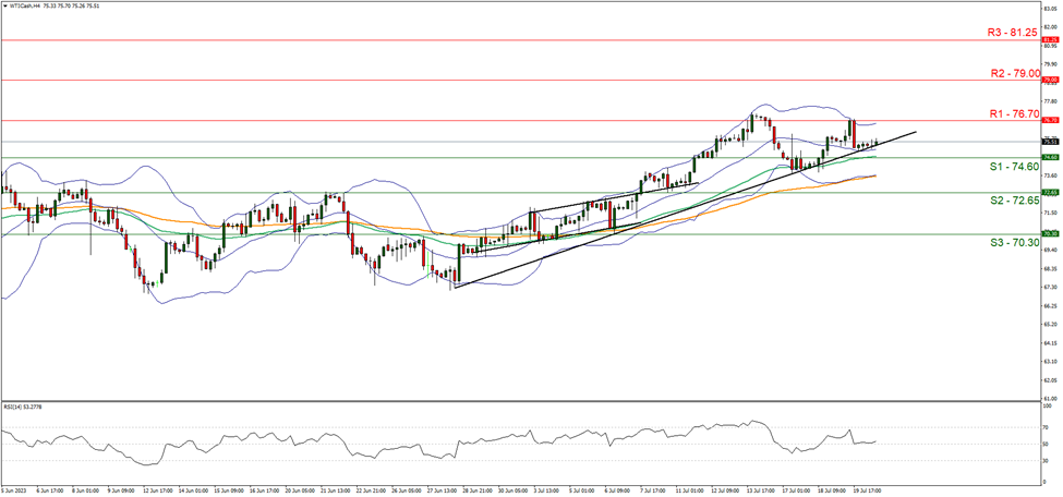 WTI’s price despite failing to break above the 76.70 (R1) resistance line, has continue to validate our upwards moving trendline and appears to be continuing to move higher . We tend to maintain our bullish outlook as long as the commodity’s price action remains above the upward trendline incepted since the 28  of June. Furthermore, we note that the price action has stabilized around the mid-range of the Bollinger bands, implying that the temporary reduction may have been a market correction. For our bullish outlook to continue, we would like to see the commodity breaking the 76.70 (R1) resistance line and aim to test  the 79.00 (R2) resistance level. On the other hand, should the bears take over, we may see  the commodity breaking the prementioned upward trendline and making a clear break below the 74.60 (S1) support level if not also aiming to test the 72.65 (S2) support base. However, we should note that the RSI indicator below our 4-Hour chart which currently registers a figure of 50, implying a neutral market sentiment. As such, should the price action remain between the 74.60 (S1) and 76.70 (R1) support and resistance levels respectively, we may see oil move in a sideways fashion.