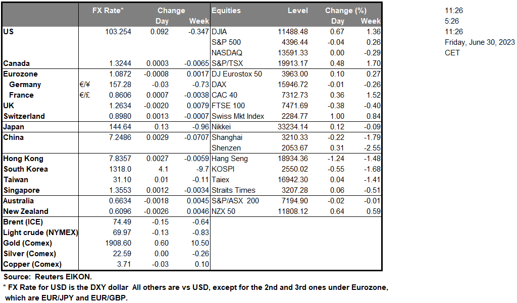 The USD was on the rise against its counterparts yesterday as the final GDP rate for Q1 accelerated beyond the market’s expectations reaching +2.0% qoq on an annualized basis. The release was another signal of a more robust US economy and tends to support the view that the US economy may be able to avoid a recession, or for it to be a shallow one. Across the Atlantic, we note that Germany’s preliminary HICP rate for June accelerated, which comes into a stark contrast with the deceleration noted for Spain and Italy. The release may harden the German hawkish view and may prompt the Bundesbank to push for more rate hikes, deepening the rift within the ECB. For the time being we highlight the release of the HICP rate of the Eurozone as a whole and a possible slowdown may weaken the EUR as it may ease the ECB’s hawkishness for the September meeting. On a technical level EUR edged a bit lower against the USD testing the 1.0855 (S1) support line. Yet for our bias for a continuance of the sideways motion to change in favour of a bearish outlook we would require the pair to break the 1.0855 (S1) support line and aim for the 1.0695 (S2) support level. Please note though that the RSI indicator nears the reading of 30, implying a built-up of the bearish sentiment for the pair. Should the bulls take over, wee may see the pair reversing course, breaking the 1.1000 (R1) resistance line and aim for higher grounds.