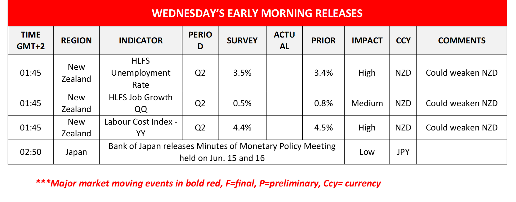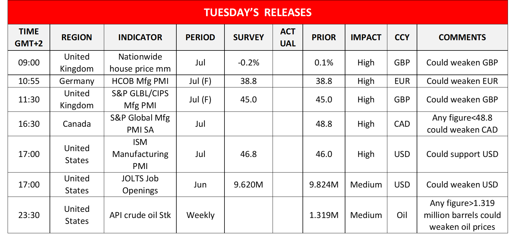 Today in the European session, we note the release of UK’s nationwide House prices for July as well as Germany’s and the UK’s final manufacturing PMI figures for July. In the American session, we note the release of Canada’s S&P Global manufacturing PMI figure and from the US we get June’s JOLTS job opening figure, while oil traders may be more interested in the release of the API weekly crude oil inventories figure. During tomorrow’s Asian session, we note that Bank of Japan releases Minutes of Monetary Policy Meeting held on Jun. 15 and 16 and we highlight New Zealand’s employment data for Q2.