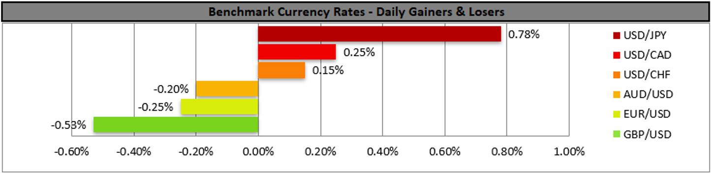 USD/CAD also edged a bit higher, yet overall remained within the boundaries of the 1.3465 (R1) and the 1.3335 (S1) levels, maintaining its sideways motion. Given the pair’s current sideways motion and the RSI indicator which is at the reading of 50 we tend to maintain our sideways motion bias. Should a buying interest be expressed by the market we may see USD/CAD breaking the 1.3465 (R1) resistance base thus paving the way for the 1.3570 (R2) resistance level. On the other hand, should sellers be in charge of the pair’s direction, we may see the pair breaking the 1.3335 (S1) support line and aim for the 1.3230 (S2) support level.