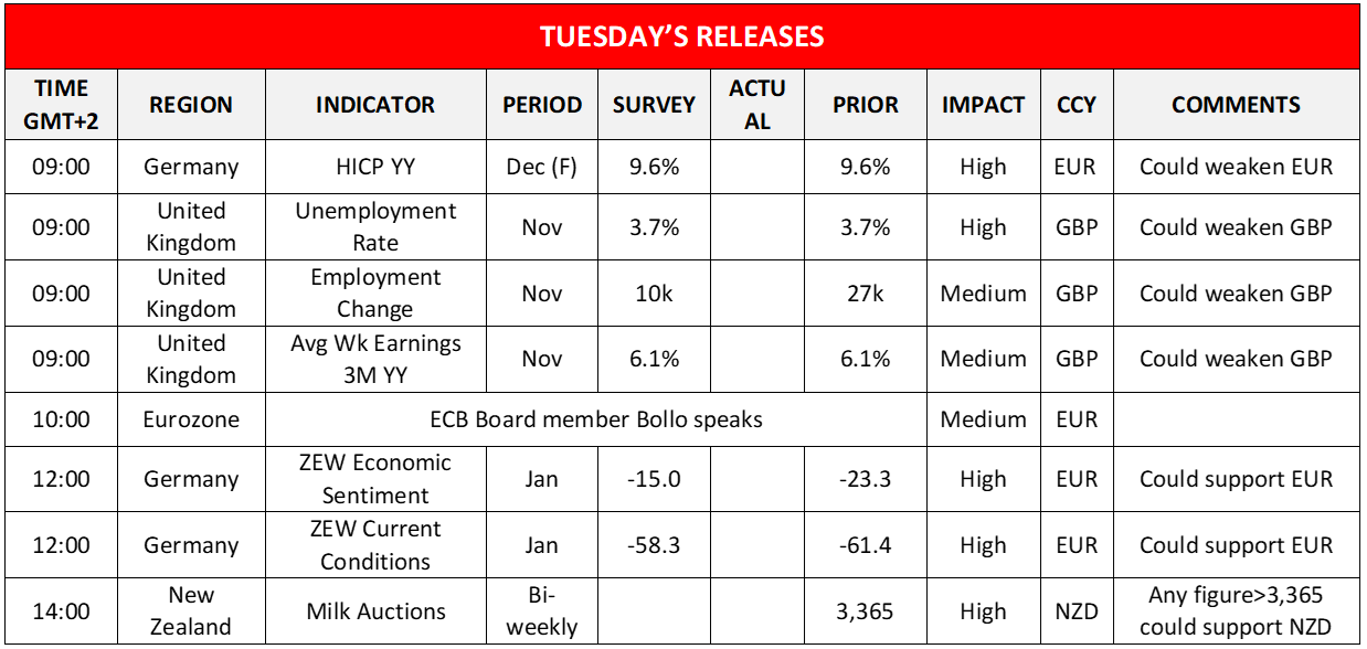 Today in the European session, we note the release of Germany’s final HICP rates for December, UK’s employment data for November, Germany’s ZEW indicators for January and later on New Zealand’s biweekly milk auctions figure. On the monetary front please note that ECB’s board member Bollo is scheduled to speak. Just before the Asian session start we get New Zealand’s electronic card sales growth rate for December. On the monetary front please note that NY Fed President Williams is scheduled to speak. During Wednesday’s Asian session, besides the highlight which is to be BoJ’s interest rate decision we also get Japan’s Machinery orders growth rate for November.