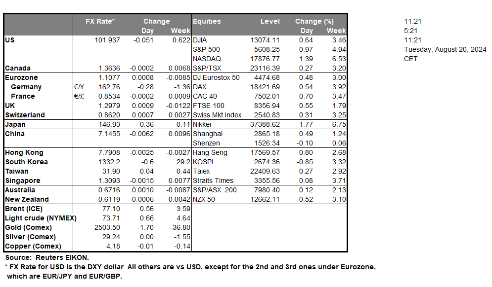 The USD continued to weaken against its counterparts yesterday as market expectations for a rate cut by the Fed in its next meeting were maintained. Fed Board Governor Waller avoided to comment on the economy and the monetary policy outlook yesterday, yet overall there seems to be a wider majority among policymakers, for an easing of the bank’s monetary policy. Main points of interest in the current week regarding the banks’ intentions are expected to be the release of the Fed’s July meeting minutes on Wednesday and Fed Chairman Powell’s speech at the Jackson Hole Symposium on Friday. Any signals confirming the market expectations for extensive rate cuts by the Fed in the coming months could weigh on the greenback. The issue is expected to have wider implications beyond the FX market and a dovish Fed is expected to support US stock markets and at the same time may also provide some support for gold’s price.