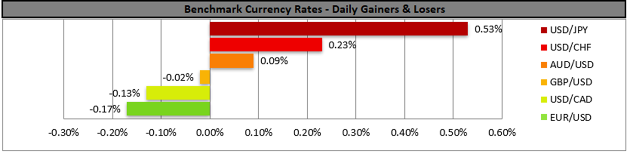 AUD/USD was on the rise yesterday after bouncing on the 0.6630 (S1) support line. Given that the pair’s price action in the upward movement was also able to break the downward trendline guiding the pair since the 4th of April, we switch our bearish outlook in favour of a sideways movement bias. It’s also characteristic that the RSI indicator rose and is now running along the reading of 50, also implying a rather indecisive market. Should the bulls take over, we may see the pair breaking the 0.6700 (R1) resistance line and aim for the 0.6760 (R2) resistance level. Should the bears be in charge of the pair’s direction, we may see AUD/USD reversing course breaking the 0.6630 (S1) support line and aim for the 0.6565 (S2) support level.