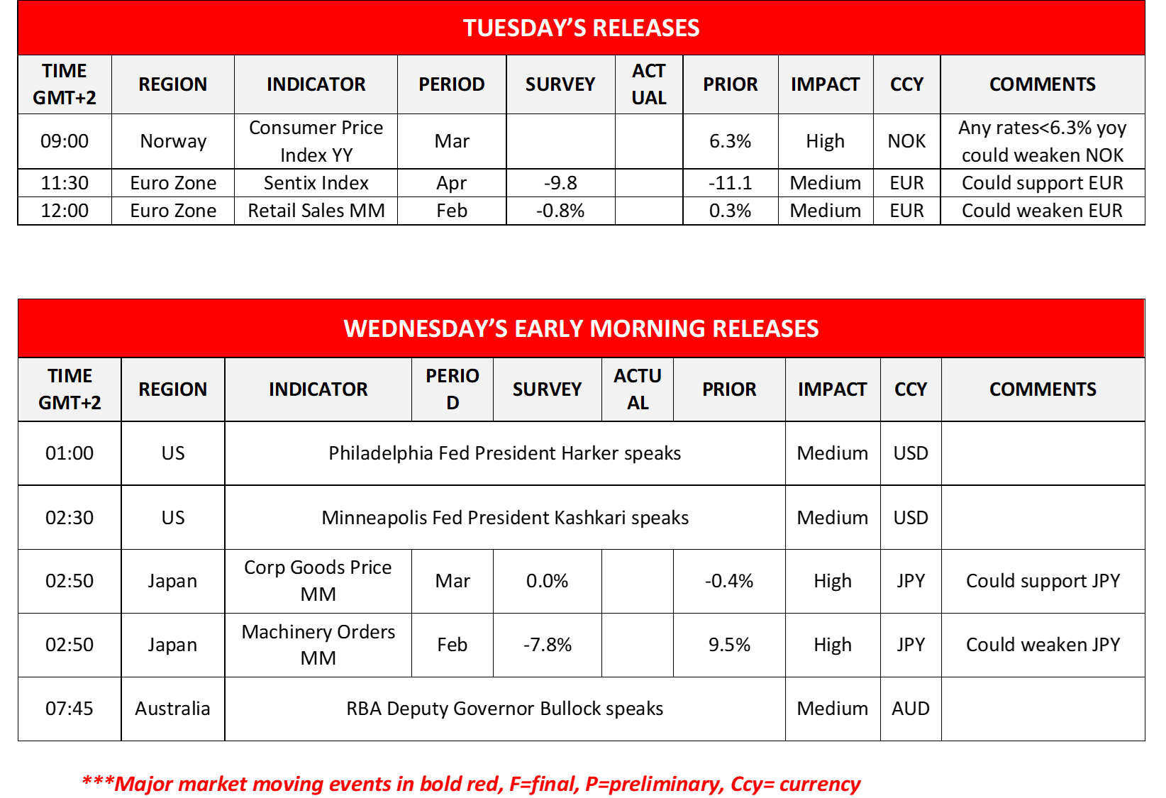 During today’s European session we note the release of Norway’s CPI rates for March, Eurozone’s Sentix Index for April and retail sales for February. During tomorrow’s Asian session, we note the release of Japan’s corporate goods prices for March and machinery orders for February. On the monetary front, we note that Philadelphia Fed President Harker, Minneapolis Fed President Kashkari and RBA Deputy Governor Bullock are scheduled to speak.