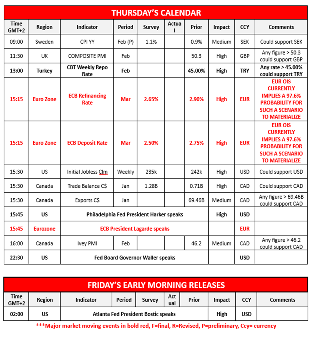 Today we get Sweden’s preliminary CPI rate and the UK’s composite PMI figure both for February, the US initial weekly jobless claims figure, followed by Canada’s trade data for January and Canada’s Ivey PMI figure for February. On a monetary level we note the interest rate decisions by the CBT, ECB and the speeches by Philadelphia Fed President Harker, ECB President Lagarde and Fed Board Governor Waller. In tomorrow’s Asian session, we note the speech by Atlanta Fed President Bostic.