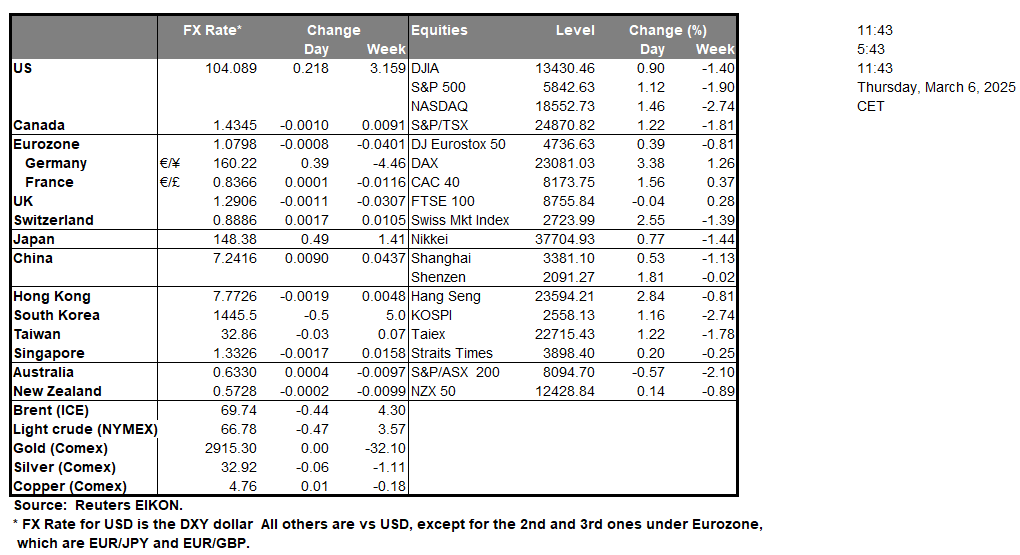 The ECB’s interest rate decision is set to occur later on today and may be the highlight of the day. The majority of market participants currently anticipate the bank to cut rates by 25 basis points, with EUR OIS currently implying 97.6% probability for such a scenario to occur. Hence, we turn our attention to the bank’s accompanying statement and ECB President Lagarde’s press conference following the decision. In our view, with President Trump seemingly going through with his tariff threats on Canada and Mexico, the ECB may be concerned about the ‘global economic outlook’, as Europe also appears to be a target of the US’s tariff ambitions. Thus, we would not be surprised to see the ECB raise concerns about the possible impact of a trade war with the US. However, Germany’s and the Zone’s preliminary HICP rates for February which were released last week, came in hotter than expected and could thus dampen the bank’s confidence to continue on their rate-cutting cycle, as inflation appears to be stubborn. Overall, we would not be surprised to see the bank implying that they may require further information before continuing on their rate cutting cycle, which in turn may be perceived as hawkish in nature and could thus aid the EUR. On the other hand, should the accompanying statement and ECB Lagarde’s press conference be perceived as dovish in nature i.e implying further rate cuts, it could instead weigh on the common currency.In the US, the ADP Non-Farm employment change figure for February was released yesterday. The figure came in significantly lower than expected at 77k versus 141k and even lower than the prior figure of 186k. The figure may imply a loosening labour market, which could weigh on the dollar. However, that story could change with the release of the US Employment data on Friday.