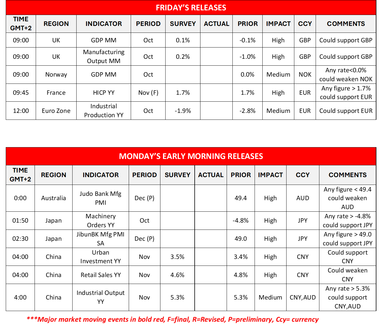 Today, we note the release of the UK’s GDP rates for October, the UK’s manufacturing output rate for October, Norway’s GDP for October, France’s final HICP rate for November and the Eurozone’s industrial production rate for October. In Monday’s busy Asian session, we note Australia’s and Japan’s preliminary PMI figures for December, Japan’s machinery orders rate for October, China’s urban investment, retail sales, and industrial output rates all for the month of November.