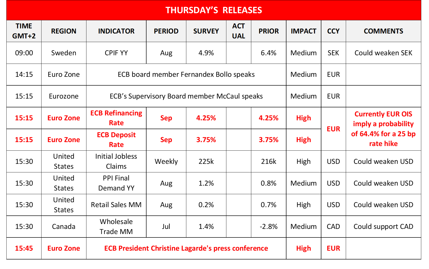 In today’s European session, we get Sweden’s CPI rates for August and in the American session, we note the release of the US weekly initial jobless claims figure, August’s PPI rates and retail sales and from Canada we get July’s wholesale trade. During tomorrow’s Asian session, we note the release of China’s Urban investment, industrial output and retail sales growth rate for August.