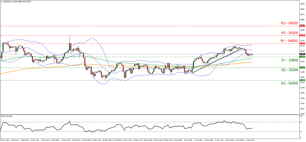 Looking at #US30Cash 4-hour chart we observe the break below the ascending trendline, initiated on the 6th of January of 2023 and the price action of the index edging closer to the 33800 (S1) support level. We hold a sideways bias for the index being confined between the 33800 (S1) support base and 34550 (R1) resistance level. Supporting our case is the RSI indicator below our 4-hour chart which currently registers a value of 46 showcasing slight indecision surrounding the index after its retracement. Should the bulls control the direction of the index we may see the break above the 34500 (R1) resistance level and the price action rising closer to the 35000 (R2) resistance barrier. Should on the other hand the bears take initiative of the direction of the index may see the break below the 33800 (S1) support level and the subsequent move closer to the 33200 (S2) support base.