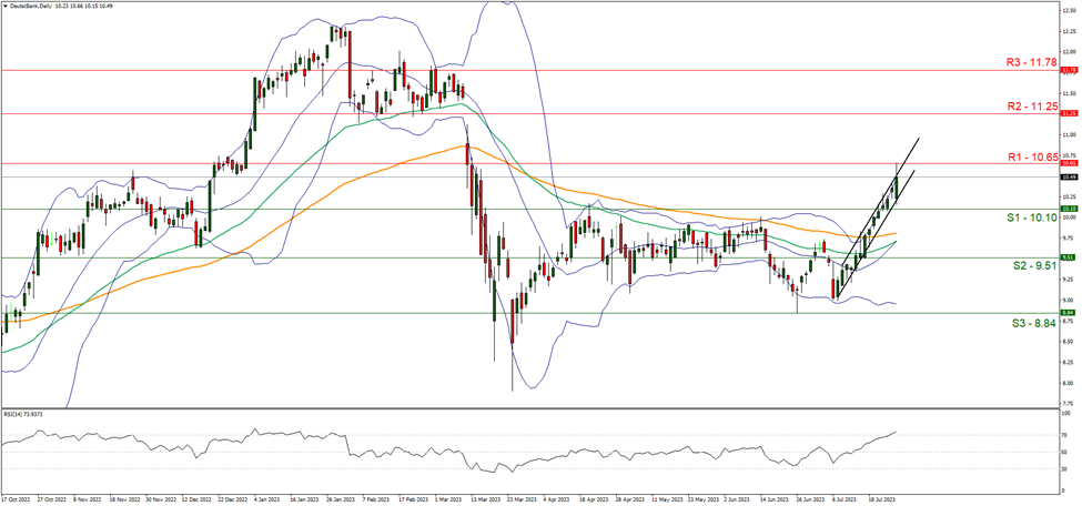 #DeutscBank appears to be moving in an upwards trajectory following the release of its earnings report today. We maintain a bullish bias for the stock and supporting our case is the RSI indicator below our 4-Hour chart which currently registers a figure above 70, implying a resilient bullish market sentiment, in addition to the upwards moving channel formed on the 7th of July. For our bullish outlook to continue, we would like to see a clear break above the 10.65 (R1) resistance level, with the next possible target for the bulls being the 11.25 (R2) resistance ceiling. On the other hand, for a bearish outlook we would like to see a clear break below the 10.10 (S1) level, with the next possible target for the bears being the 9.51 (S2) support base. Furthermore, we should note that the extreme widening of the Bollinger bands imply high market volatility and as such could lead to volatile price swings.