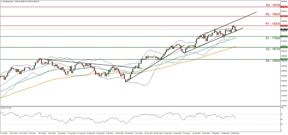 The US Employment data for February is due to be released on Friday. In particular, we are keeping a close eye on the Non-Farm Payrolls figure which is expected to come in at 190k versus last month’s figure of 353k, thus implying an easing of the US labour market. Furthermore, the Average Hourly earnings rate is expected to decelerate to 4.4% yoy, implying a reduction in the purchasing ability of consumers, which may translate to a further easing in inflationary pressures in the US economy. Yet the tick-down of the rate may prove immaterial.