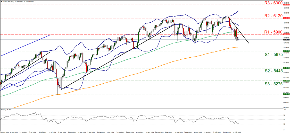 On a technical level, since our last report S&P 500 retreated breaking the 5900 (R1) support line now turned to resistance. Given the intensification of the index’s drop we maintain our bearish outlook for S&P 500 and intend to maintain it as long as the price action remains below the downward trendline, guiding S&P 500 since the 20th of February and we view any correction higher as temporary. We do though, also highlight two points of warries for the bears, the first being that the RSI indicator is nearing the reading of 30, implying that the index is approaching oversold levels and may be ripe for a correction higher. Similar signals come from the fact that the price action is constantly putting the lower Bollinger band to the test. Should the bears maintain control over the index as expected we may see it breaking the 5675 (S1) support line, thus paving the way for the 5445 (S2) support base. On the flip side, should the bulls take over, we may see the index’s price action reversing course breaking initially the prementioned downward trendline, in a first sign that the downward movement has been interrupted and continuing to break the 5900 (R1) resistance line and opening the gates for the 6120 (R2) resistance barrier that marks practically an all-time high level for the index.