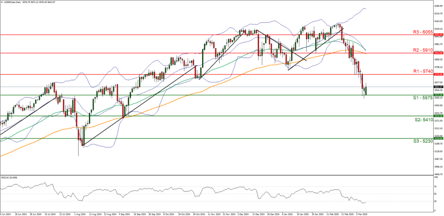 S&P 500 appears to be moving in a downwards fashion, with the pair having tested our 5575 (S1) support level. We opt for a bearish outlook for the index and supporting our case is the RSI indicator below our chart which currently registers a figure close to 30 implying a strong bullish market sentiment. Yet the figure despite being close to 30, is still under that figure which could also imply that the index may be oversold and due a correction to higher ground. Nonetheless, for our bearish outlook to continue we would require a clear break below the 5575 (S1) support level with the next possible target for the bears being the 5410 (S2) support line. On the other hand, for a sideways bias we would require the index to remain confined between the 5575 (S1) support level and the 5740 (R1) resistance line. Lastly, for a bullish outlook we would require a clear break above the 5740 (R1) resistance line with the next possible target for the bulls being the 5910 (R2) resistance level.