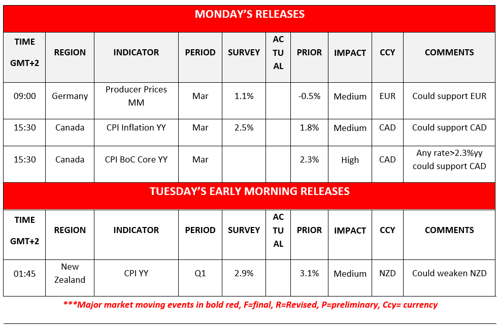 Tomorrow, Tuesday we get UK’s employment data for February and the US retail sales for March. On Wednesday, we get the UK CPI Rates for March, while in Turkey CBT is to release its interest rate decision. On Thursday we get April’s preliminary PMI figures for the EuroZone, the UK and the US and on Friday we highlight Japan’s CPI rates for March.