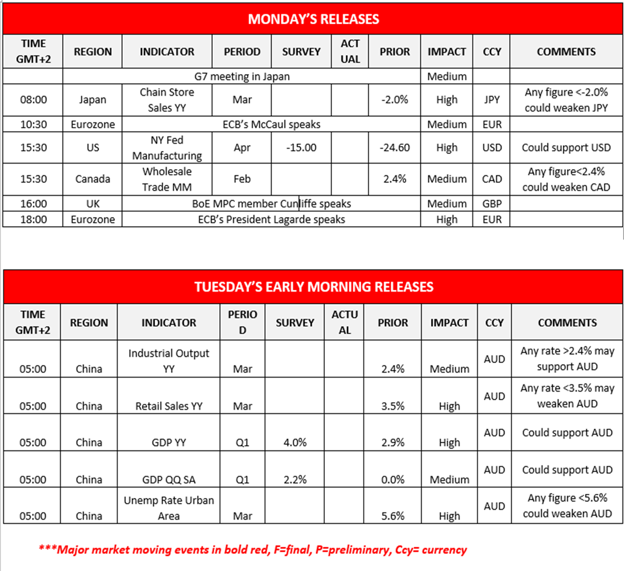 In Europe’s session, note ECB’s McCaul’s speech. In the American session we note the NY Fed Manufacturing survey for April followed by Canada’s Wholesale sales for February. Furthermore, we note that ECB’s President Lagarde and BoE MPC Cunliffe are due to speak later during the day. During tomorrow’s Asian sessions we note China’s Industrial Output,Retail sales and Unemployment Rate all for March, in addition to GDP rates for Q1.