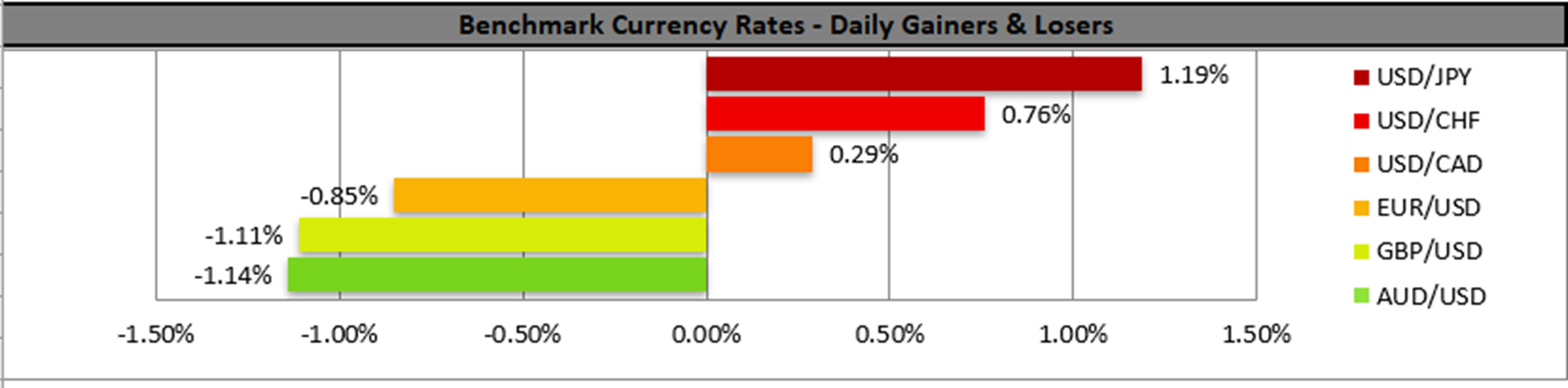 EUR/USD dropped lower yesterday breaking the 1.10 psychological barrier. We tend to maintain a bullish outlook for the pair as the price action remains above the upwards trendline formed on the 24th of March. It should be noted that the RSI indicator is near the reading of 50, implying potential indecisiveness by the market. Should the pair continue to be under the control of the bulls we may see it aiming if not breaking above the 1.1050 (R1) resistance level with the next possible target for the bulls being the 1.1125 (R2) resistance level. On the other hand, should the bears take over the pair, we would like to see a clear break below the 1.0930 (S1) followed by a breaking of the aforementioned upwards trendline, with the next possible targets for the bears being the 1.0830 (S2) support base. However, should the pair remain between support at 1.0930 (S1) and resistance at 1.1050 (R2) in addition to the RSI indicator remaining at 50, we could potentially see the pair move in a sideways motion.