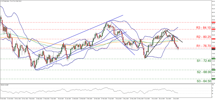 WTI’s price has tumbled since our last week, breaking consecutively the 80.25 (R2) and the 76.70 (R1) support levels, both of which have now turned to resistance. The commodity’s price action intensified its downward inclination since our last report after a relative stabilization, which served mostly as a confirmation of the downward movement. We tend to maintain a bearish outlook given that the RSI indicator is nearing a reading of 30, highlighting the strong bearish sentiment for the commodity’s price among market participants.