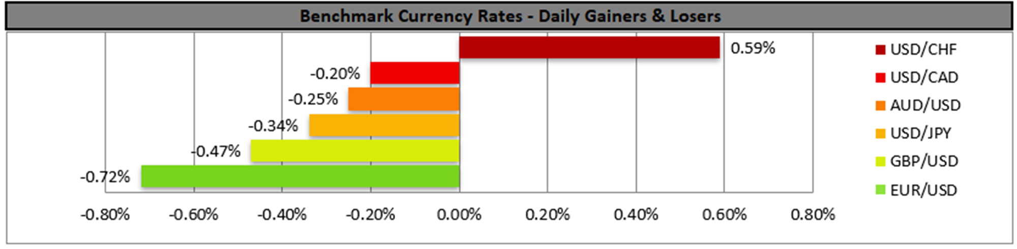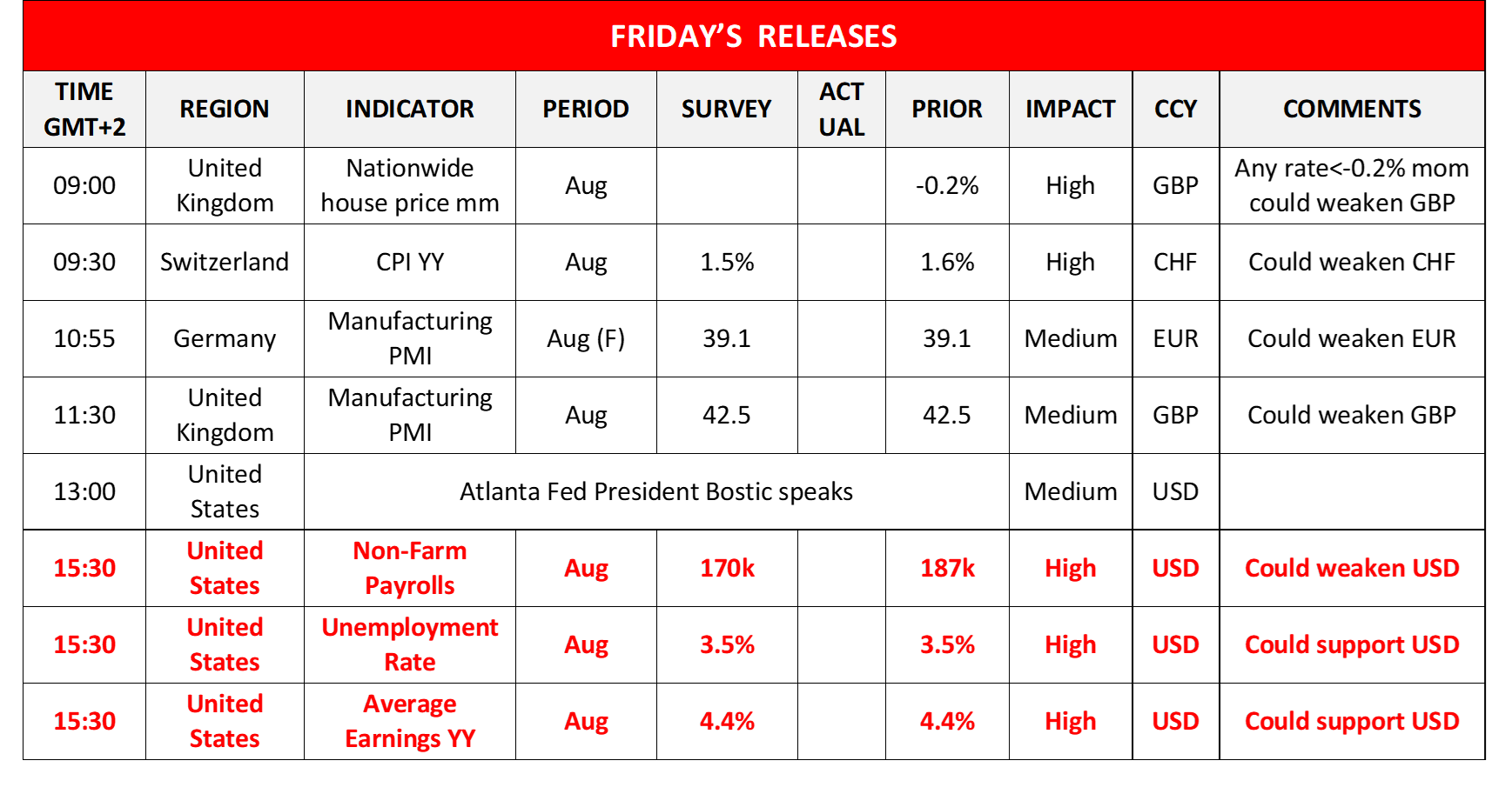 The USD edged higher and stabilised against its counterparts yesterday, ahead of the release of the US employment report for August. We note that the market’s expectations may have been enhanced especially for the NFP figure to come in lower, after the wider-than-expected drop of the ADP figure for the same month, which implied that hiring in the private sector slowed down. Today we highlight the release of the US employment report for August and the NFP figure is expected to drop implying a continuance of the weakening of the US economy’s ability to actually create new positions, while the unemployment rate is expected to remain unchanged at 3.5%, implying that the US employment market remains tight. Furthermore, the average earnings growth rate is expected to remain unchanged at 4.4% yoy implying that the US employment market may continue feeding inflationary pressures in the US economy. For the time being, we expect to have mixed signals from the release, yet note that the drop of the NFP figure may disappoint traders especially should it be wider than expected thus weakening the USD, yet there is wide uncertainty for the actual rates and figures to be released. The release could increase volatility substantially for USD pairs hence caution is advisable if one should trade at that time. We highlight that the release may have wider ripple effects beyond the FX market and should data show an easing of the US employment market we may see support rising for US stock markets and gold’s price and vice versa.