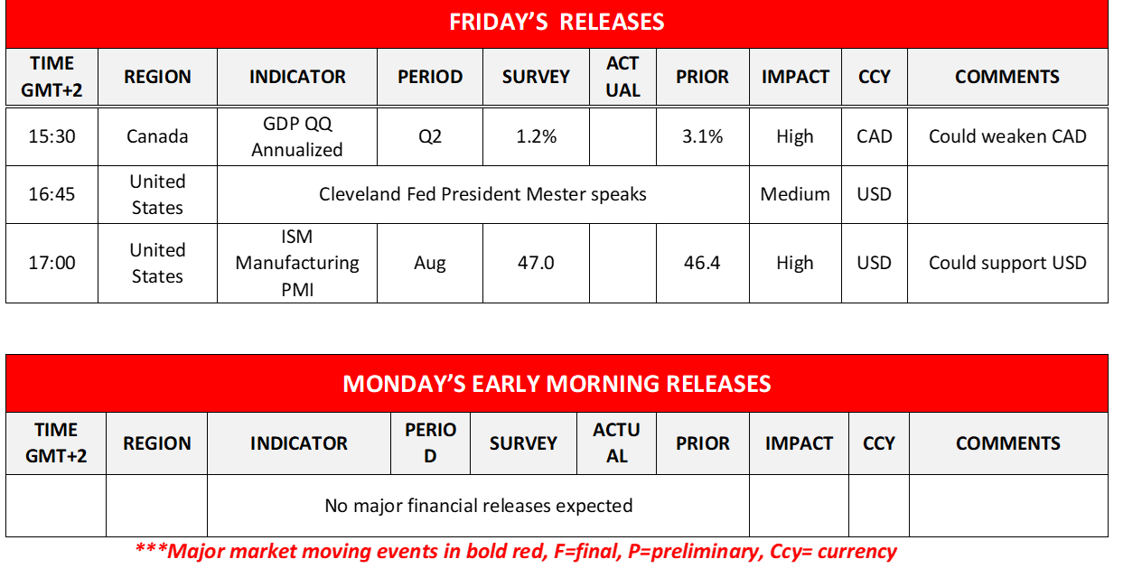 Today, we note from the UK the release of the Nationwide house prices and final manufacturing PMI figure, Germany’s final manufacturing PMI and Switzerland’s CPI rates all being for August. From the US besides the US employment report for August, we get the ISM manufacturing PMI figure for August and from Canada the GDP rate for Q2. On the monetary front please note that Atlanta Fed President Bostic and Cleveland Fed President Mester are scheduled to speak.