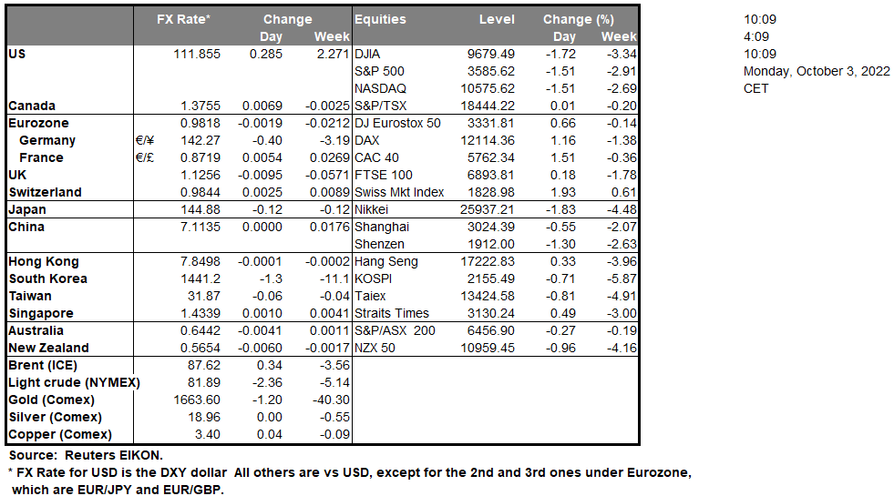 On Tuesday we get from Japan Tokyo’s CPI rates for September, Australia’s building approvals for August, RBA’s interest rate decision and in the American session we note the release of the US factory orders for August. On Wednesday we note the release of Australia’s services PMI figure for September, the Jibun Bank services PMI figure for September, from New Zealand RBNZ’s interest rate decision, France’s, Germany’s the Eurozone’s, UK’s and the US S&P PMI figures while from the US we also get the ISM non manufacturing PMI figure for September and the EIA weekly crude oil inventories figure. On Thursday we note Australia’s trade data for August, Germany’s industrial orders for August, Sweden’s GDP for August and from the US the weekly initial jobless claims figure. On Friday we get Germany’s industrial output for August, the US employment report for September as well as Canada’s employment data for the same month.