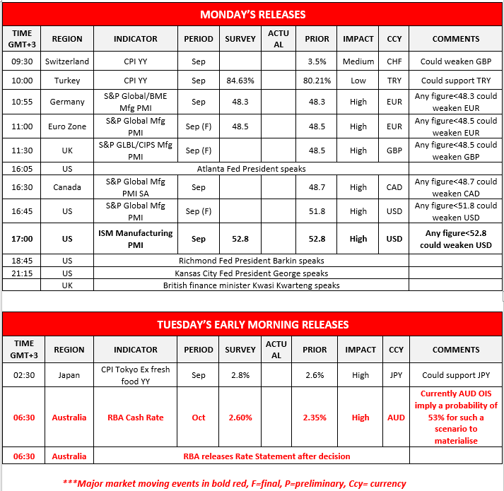Today in the European session we get Switzerland’s CPI rates for September, Turkey’s CPI rates for the same month, Germany’s, Eurozone’s and UK’s manufacturing PMI figures for September and in the American session we get from the US and Canada the S&P manufacturing PMI figure for September as well as the US ISM manufacturing PMI figure for the September.