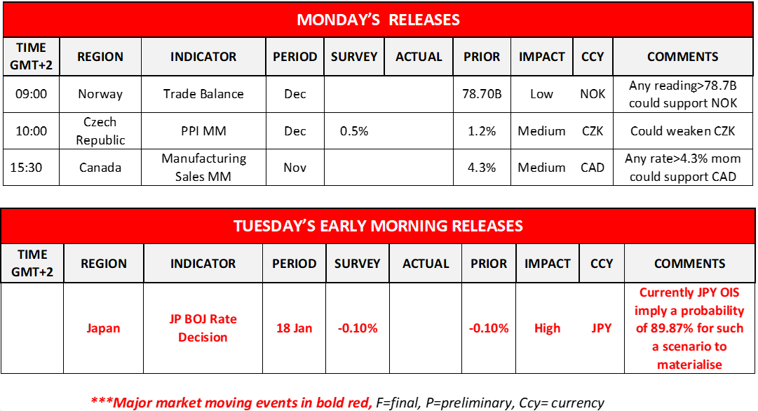 Besides BoJ’s interest rate decision during tomorrow’s Asian session we note today the release of Norway’s Trade Balance for December, the Czech Republic’s PPI rates for December and Canada’s Manufacturing sales for November.